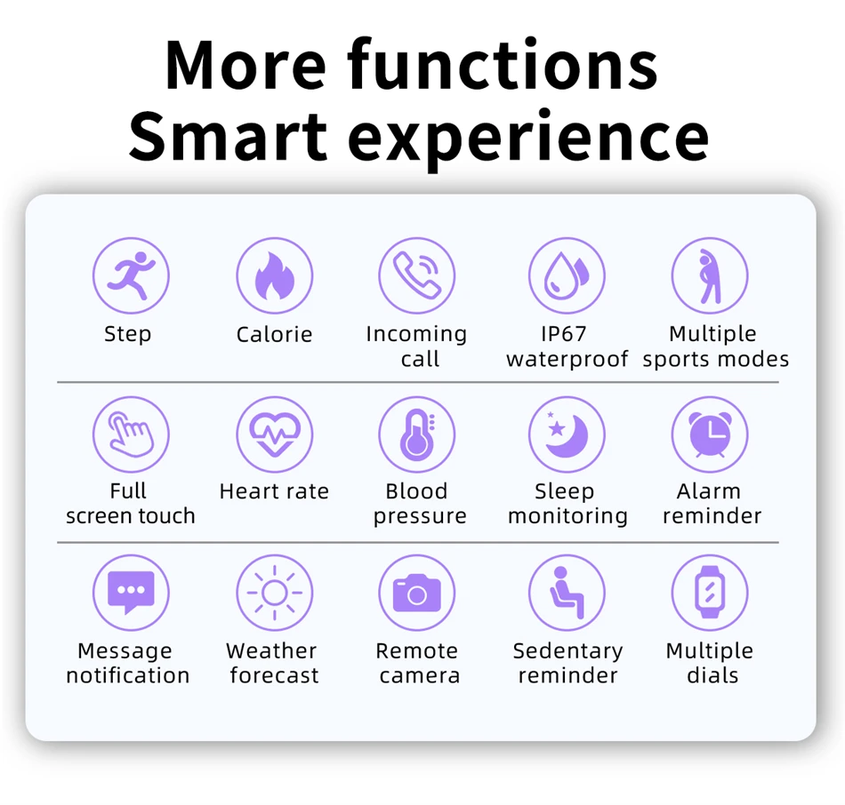 Information Reminder There are function enable switches on the APP side (incoming calls, text messages, Wechat, QQ, Facebook, Twitter, LinkedIn, WhatsApp, Line, Instagram, Snapchat, Skype and other mobile applications) and events such as sitting, alarm clock, drinking water, taking medicine, etc. Information reminder, alarm clock, photo, raised wrist screen, sedentary reminder, stopwatch, countdown, search for mobile phone, bracelet brightness adjustment, bracelet screen duration adjustment, step counting, heart rate data synchronization APP support, exercise, mileage, calories, Steps, sleep, total sleep, deep, light sleep time, history record, heart rate, blood pressure, sleep, exercise
